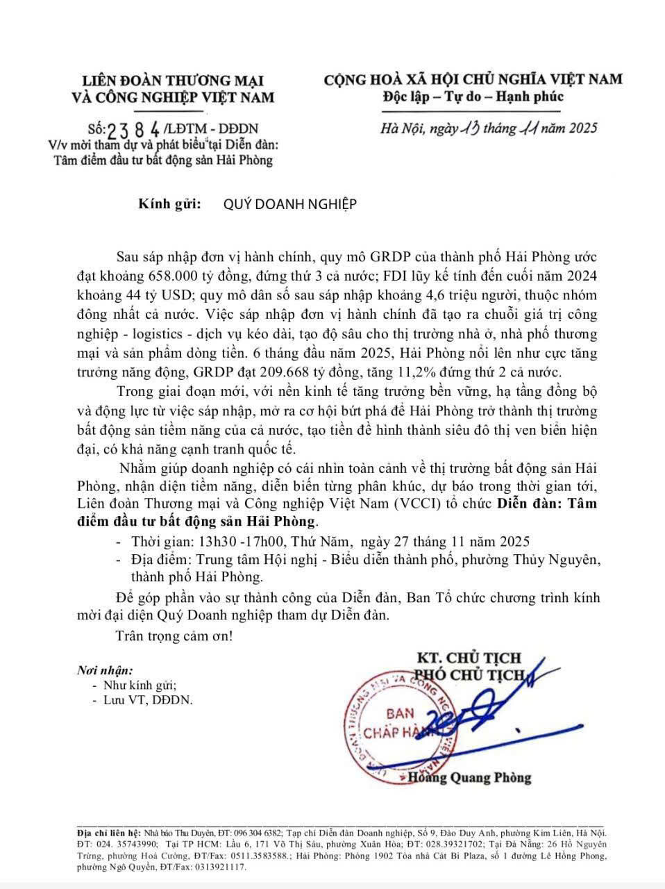 Chúng tôi xin nhắc quý doanh nghiệp về sự kiện “Tâm điểm đầu tư bất động sản Hải Phòng”. Diễn đàn do VCCI, UBND TP Hải Phòng chỉ đạo, Tạp chí Diễn đàn Doanh nghiệp phối hợp với Hội Môi giới Bất động sản Việt Nam, Hiệp hội Bất động sản Hải Phòng tổ chức, nhằm dự báo thị trường bất động sản Hải Phòng trong thời gian tới.